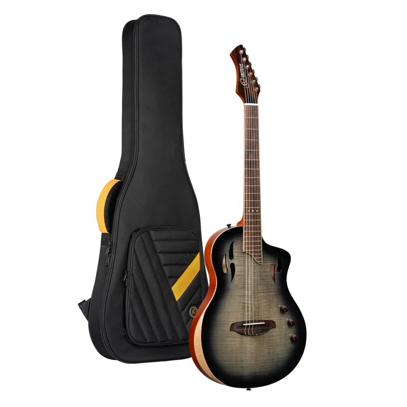 Die TourPlayer ist eine innovative Nylonsaitengitarre, entwickelt für den Einsatz auf der Bühne. Sie verbindet den warmen Klang von Nylonsaiten mit der Dynamik einer E-Gitarre und bietet ein modernes Spielgefühl. Der bequeme D-Hals und die 48 mm Sattelbreite machen sie besonders für Spielerinnen und Spieler geeignet, die von Stahlsaiten auf Nylon umsteigen möchten. Das wiederaufladbare Ortega Preamp-System sorgt für flexible Klangregelung ohne Rückkopplungen. Jede TourPlayer wird mit einer passenden, robusten Gigbag geliefert – ideal für unterwegs.